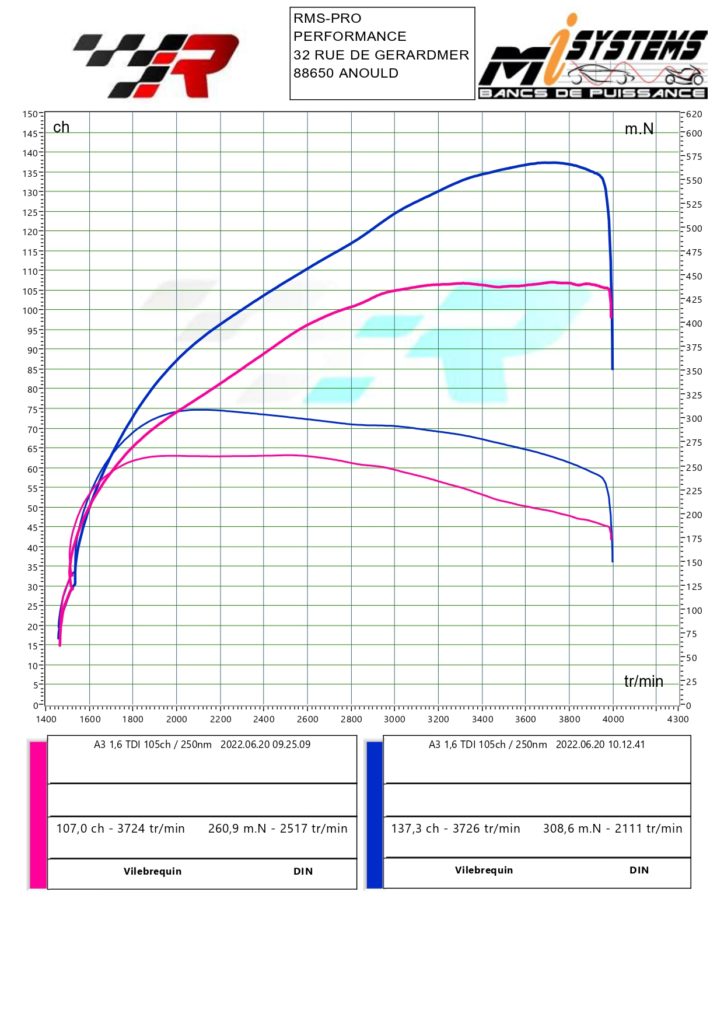 Voici les résultats obtenus après reprogrammation du calculateur moteur. Nous veillons à ne pas dépasser les tolérances fixées par le constructeur, tant au niveau du moteur que de la boîte de vitesse.